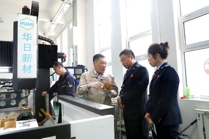 图为国家税务总局本溪市明山区税务局干部走进华日新材,了解企业研发与创新情况。姚希豪丁旭/摄